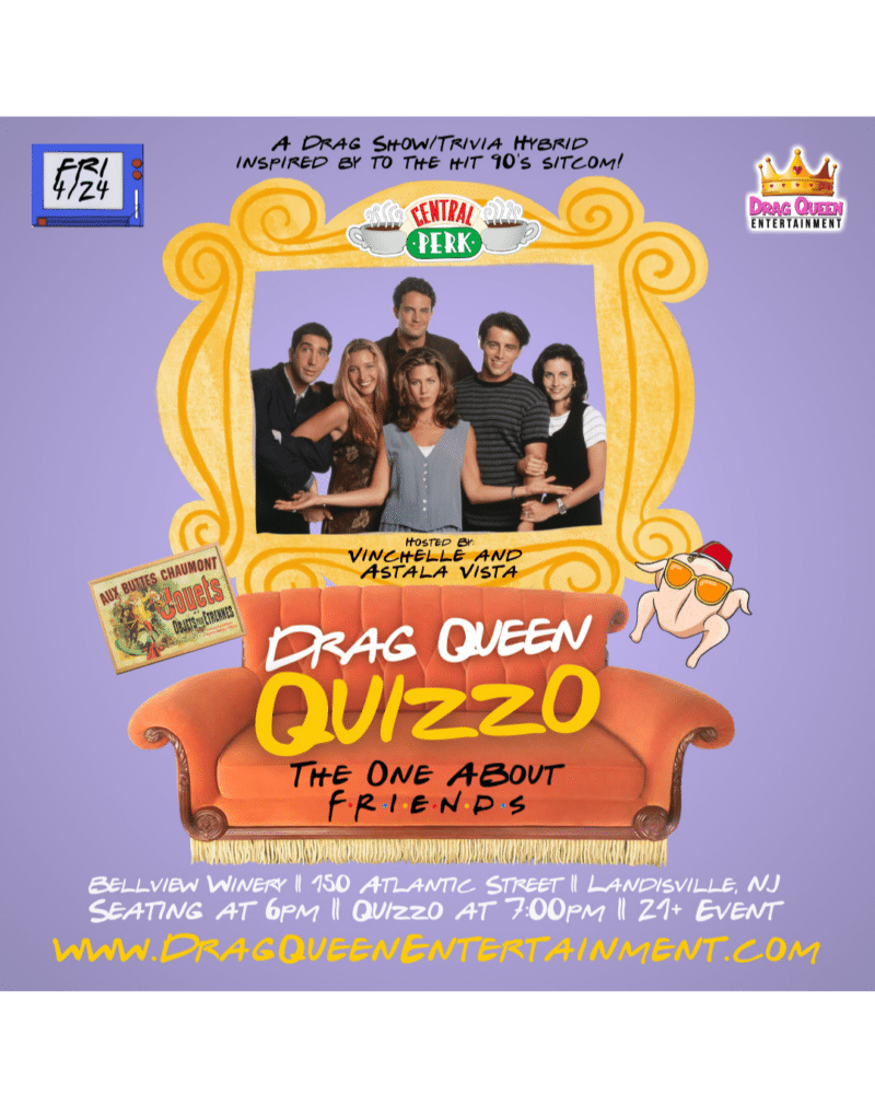 Apr 24 Drag Queen Quizzo – The One About F-R-I-E-N-D-S 7:00 pm - 9:00 pm Bellview Winery 150 Atlantic Street, Landisville Event Details Get Directions