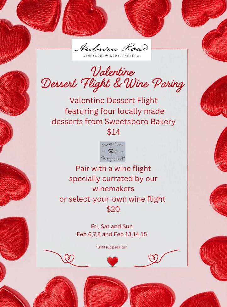 Feb 6 February 6—12:00 pm - February 15—5:00 pm Valentine’s Dessert Flight and Wine Pairing Auburn Road Vineyards 117 Sharptown-Auburn Rd, Pilesgrove Event Details Get Directions