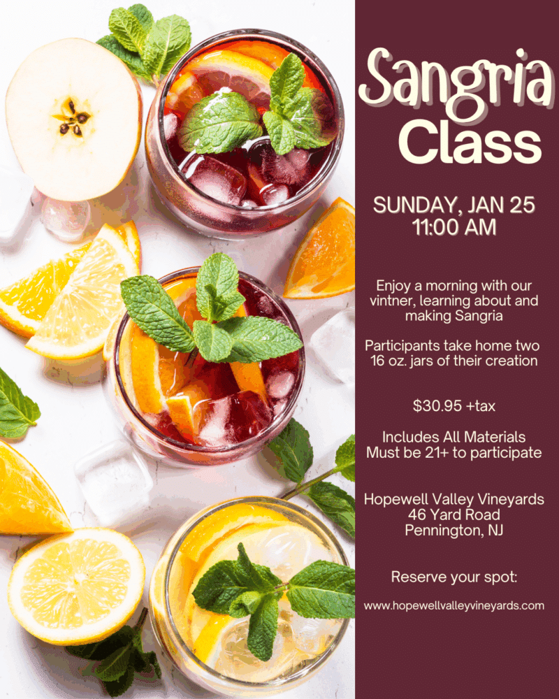 Jan 25 11:00 am - 1:00 pm Sangria Workshop Hopewell Valley Vineyards 46 Yard Road, Pennington Event Details Get Directions