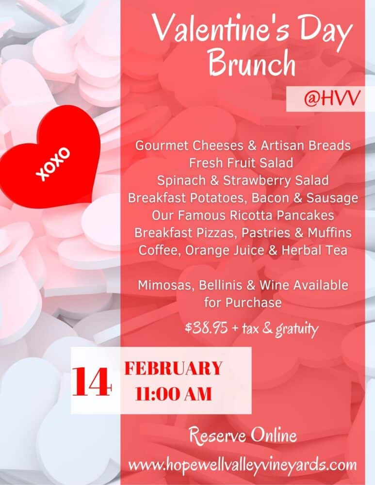 Feb 14 11:00 am - 1:00 pm Valentine’s Brunch Hopewell Valley Vineyards 46 Yard Road, Pennington Event Details Get Directions