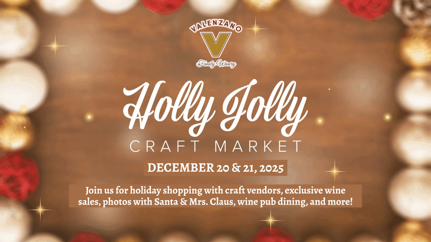 Dec 20 December 20—12:00 pm - December 21—4:00 pm Holly Jolly Craft Market at Valenzano Winery Valenzano Winery 1090 Rt 206, Shamong Event Details Get Directions