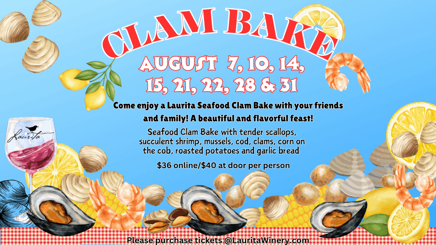 Aug 14 5:00 pm - 8:00 pm Summer Seafood Clam Bake At Laurita Winery August 14 and 15 Laurita Winery 85 Archertown Road, New Egypt Event Details Get Directions