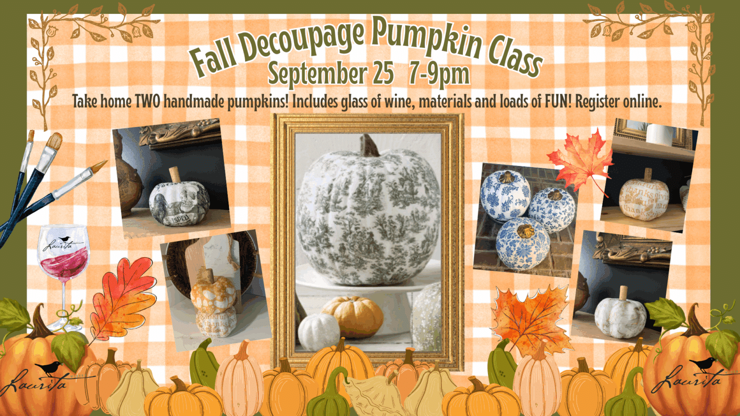 Sep 25 7:00 pm - 9:00 pm Fall Decoupage Pumpkin Night, September 25 at Laurita Laurita Winery 85 Archertown Road, New Egypt Event Details Get Directions
