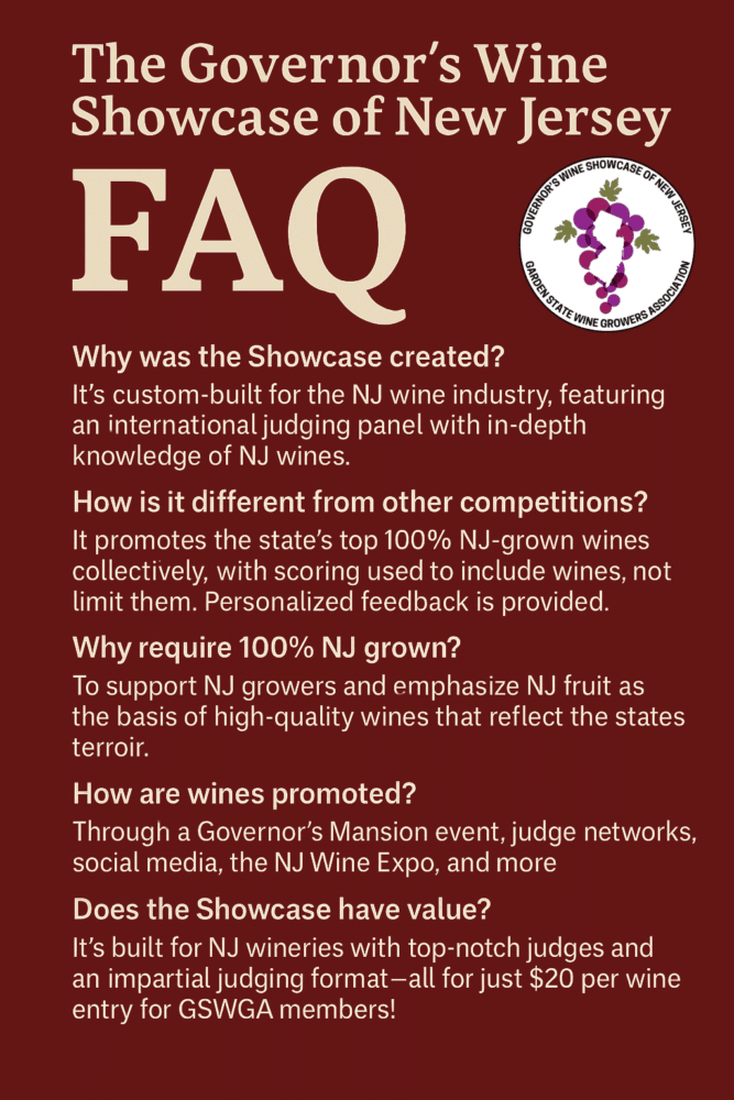 The Governor’s Wine Showcase offers exceptional value, especially for GSWGA members. The cost is just $20 per wine, significantly lower than typical competition fees that range from $80 and up. The Showcase not only provides professional feedback and exposure but also contributes to building the collective reputation of NJ wines. Participating in the Showcase strengthens the perception of NJ as a credible and thriving wine region.